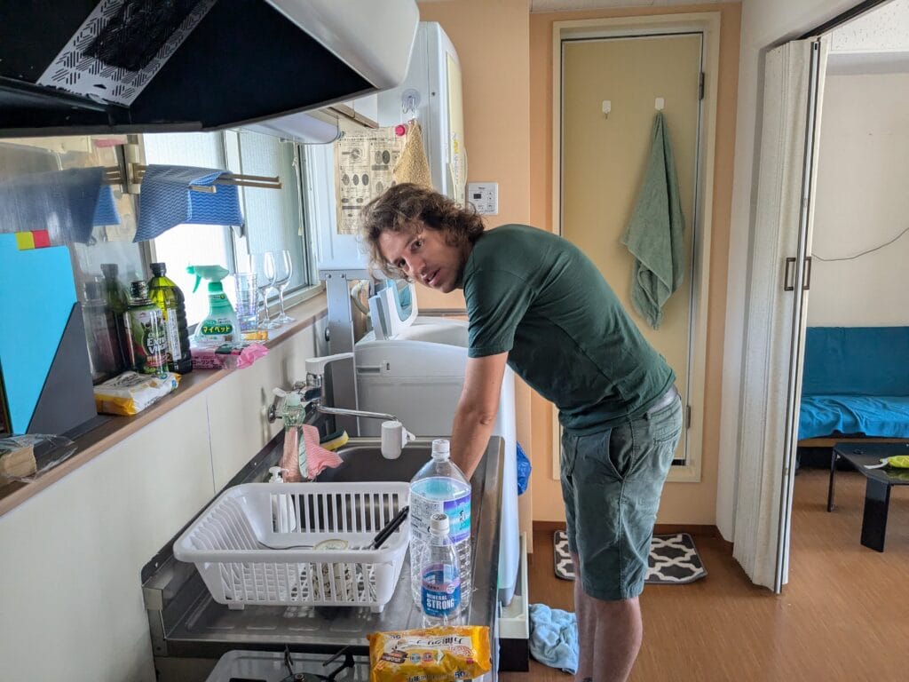 We’re not particularly tall people, but still, everything here feels small and cute to us. The cars, affectionately dubbed “rice cookers,” are adorable little boxes on wheels, like something out of a toy set. Surprisingly, despite the aerodynamics of a house, they’re remarkably fuel efficient due to their small engine (660cc). When driving or walking through the city, it seems that all the advertisements and warning signs have gone through a cuteness filter; everything is miniaturized and “cutified,” from smiley-faced trash bins to cartoonish road signs. For example, the warning sign for landslides is a crying mountain that loses rocks. Our apartment is also tiny and cute, we had to rearrange the living room to be able to walk around a bit. We have to discuss the bathroom as well, and no, not the Japanese toilets of the future everyone is familiar with, but the prefab bathroom cubes. These bathrooms, often 1,51,52 meters, are pre-fabricated and put together like an IKEA puzzle to fit the tiniest apartments. You’ll find them in many hotel rooms, and we get to enjoy them daily. Though small, these bathrooms tick all the boxes: Toilet? Check. Sink? Check. Shower? Check. Bathtub? Check. An impressive use of space, just one tiny oversight, they forgot to leave room for an actual person! It’s so small that Erik barely fits on the toilet and might be permanently stuck in there somewhere around Christmas.