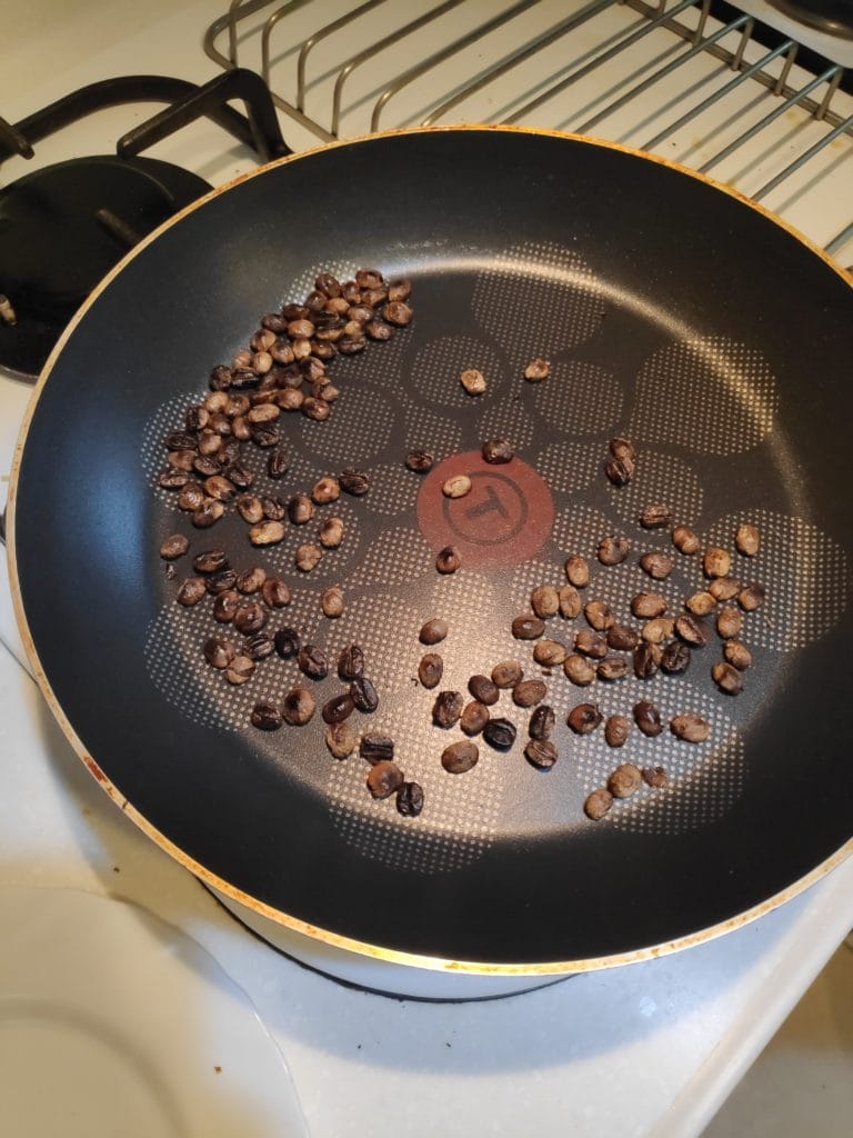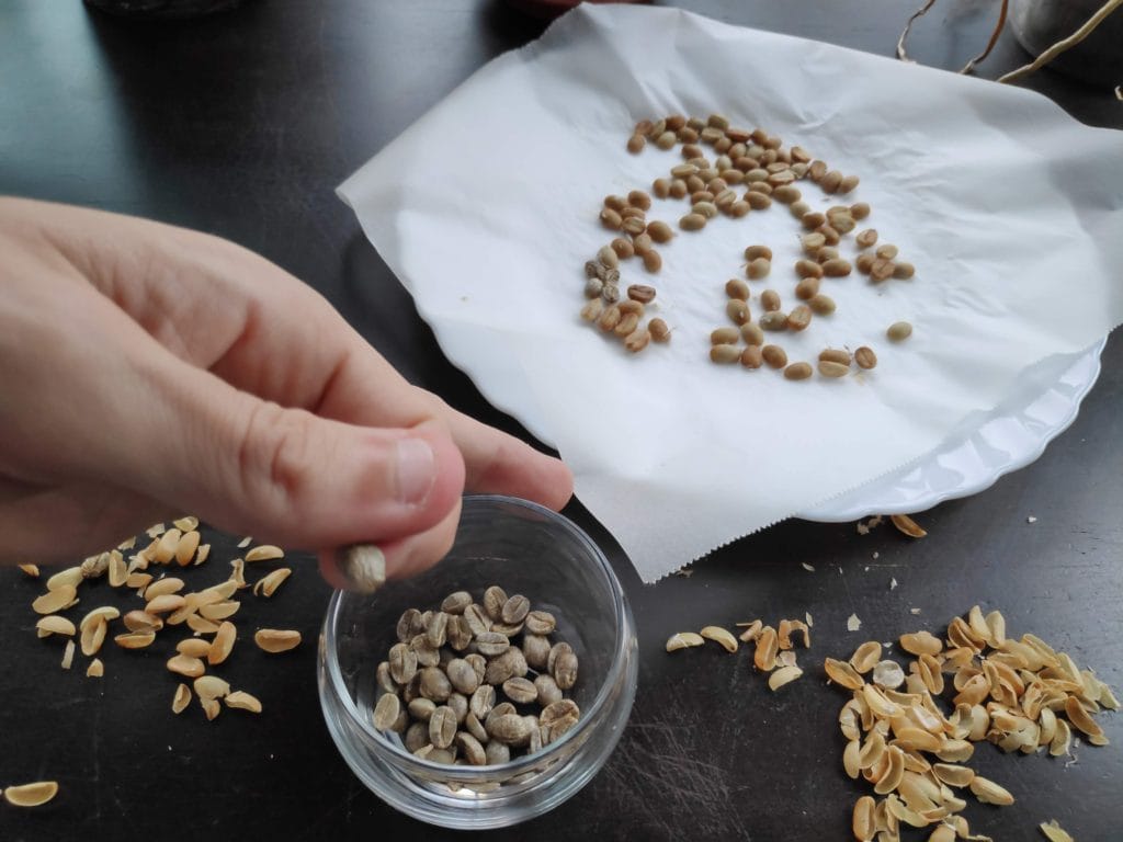Of course we also wanted to try if we could make a decent cup of our own arabica coffee. We picked some red beans growing along the Dongshan road and peeled them, dried them, peeled them again and dried them until they were ready to roast (according to our understanding). We read that you can roast them in a pan and have to wait for the typical crack sounds to know if they are ready. We like a strong cup of coffee, so we waited until we heard the second crack…which didnโt come while the beans were starting to smell really burned and were roasted unequally. In the end we heard a few beans crack for the second time, but the burning smell became too strong now, so we decided it was time to stop and grind the beans. In the end it was a very bad cup of coffee… It was a fun experience but we will leave it to the experts.